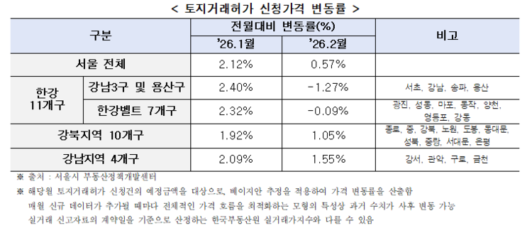 반면 시장의 향방을 보여주는 토지거래허가 신청 건수는 급감했다. 2월 서울 아파트 토지거래허가 신청은 4천521건으로 전월 6천438건 대비 29.8% 감소했다. 신청 가격 상승세 역시 전월 1.48%에서 2월 0.57%로 둔화됐다.