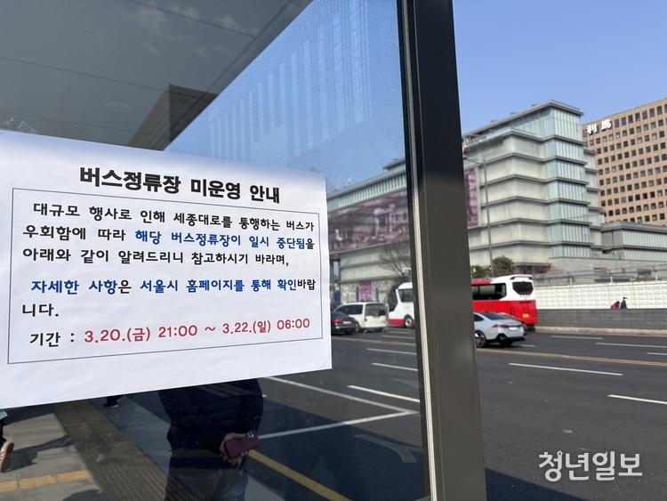 【 청년일보 】 방탄소년단(BTS) 컴백 공연을 하루 앞둔 20일 서울 종로구 광화문광장 무대 앞 버스정류장에 금일 오후 9시부터 22일 오전 6시까지 버스정류장 운영을 일시적으로 중단한다는 안내문이 붙어있다.