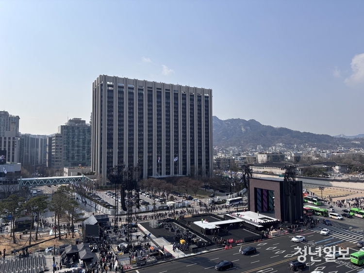 【 청년일보 】 방탄소년단(BTS) 컴백 공연을 하루 앞둔 20일 서울 광화문광장에서 메인 무대 설치와 공연 준비 작업이 진행 중이다.