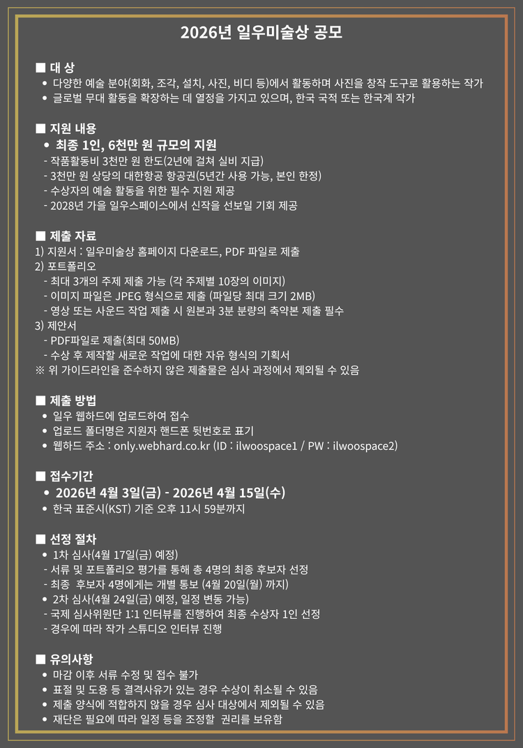 일우미술상은 장르와 매체의 제한을 두지 않고 사진을 작업 과정의 일환으로 활용해 제작된 모든 작품을 대상으로 선정한다. 2026 일우미술상은 총 1명을 최종 선정해 총 3천만 원 규모의 작품 제작 활동비 및 3천만원 상당의 대한항공 항공권과 '일우스페이스'에서의 개인전 기회를 지원한다.