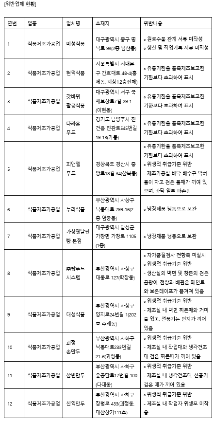 경북 경산시의 피앤엘푸드는 '납짝만두'(만두류) 제품을 만들면서 유통기한을 품목 제조 보고한 내용보다 1~2일 초과 표시해 보관하다가 걸렸다. 이 업체는 만두소를 만드는 제조·가공실을 제대로 청소하지 않아 바닥은 배수구가 막혀 물이 차고 검은 물때가 끼어 있는 등 청결하게 관리하지 않았다.