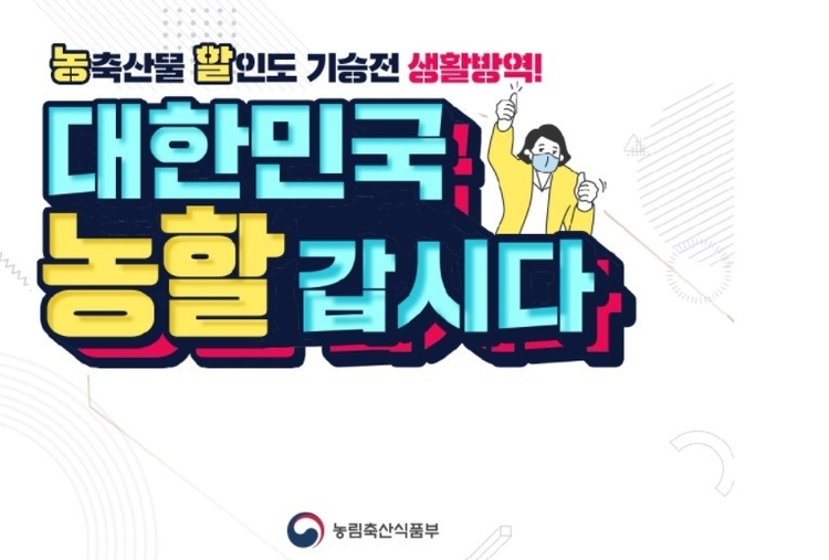 농림축산식품부와 한국농수산식품유통공사는 코로나19 장기화로 위축된 농축산물 판로 확대를 위해 '대한민국 농할 갑시다' 캠페인을 지자체·공공기관몰·전통시장·생협 직매장 등과 함께 확대·진행한다.