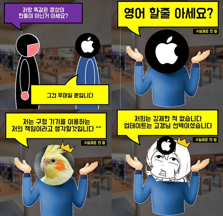 무엇보다 이용자를 대하는 직원의 태도가 더 큰 화를 초래했다. 두 번째 방문 시에는 현재 매장에 매니저가 미국 사람밖에 없다며 "영어가 가능하냐"고 이용자에게 물었으며, 세 번째 방문 때에는 입장 바꿔서 생각해보라는 이용자의 말에 애플스토어 가로수길점 매니저는 "저는 구형 기기를 이용하는 저의 책임이라고 생각할 것입니다"라고 말했다.