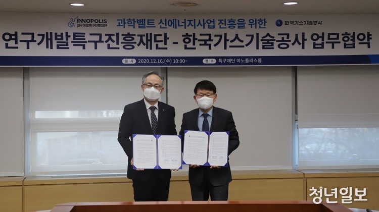 【 청년일보 】 한국가스기술공사(사장 고영태)는 지난 16일 연구개발특구진흥재단(이사장 양성광, 이하‘특구재단’)과 대전광역시 국제과학비즈니스벨트(이하 ‘과학벨트’) 거점지구 내 수소산업 등 그린뉴딜 생태계 조성을 위해 업무협약(MOU)을 체결하였다.