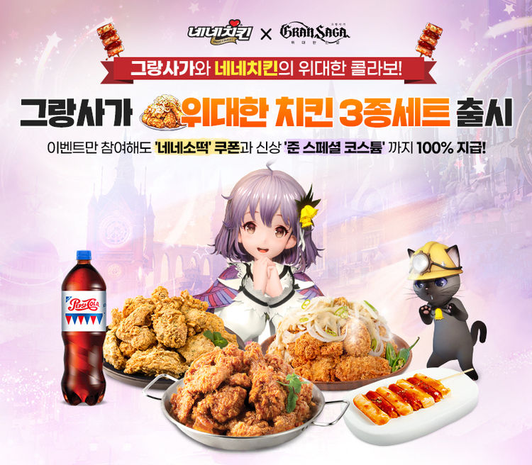 이번 제휴를 통해 네네치킨의 대표 메뉴와 그랑사가의 인기 캐릭터를 활용한 '그랑사가 위대한 치킨 세트' 3종을 선보이며, 오는 7월 2일까지 전국 네네치킨 매장 및 배달앱 등을 통해 주문할 수 있다.