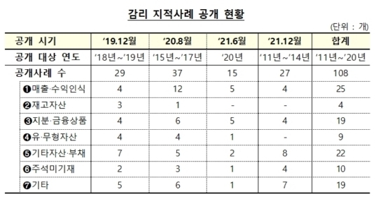 금융감독원은 29일 회계포털 웹사이트에 감리지적 사례 27건을 추가 공개. 이번 공개 사례는 지난 2011~2014년 사이 지적된 사례들로, 유형 별로는 기타자산·부채 사례가 8건으로 가장 많은 것으로 조사.