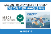 【 청년일보 】 우리금융그룹(회장 임종룡)은 세계적인 투자정보 제공기관인 MSCI(모건스탠리캐피털인터내셔널)가 실시한 2025년도 ESG 평가에서 3년 연속 최상위 등급인 AAA등급을 획득했다고 16일 밝혔다. MSCI ESG 평가는 전 세계 8,500개 이상 상장기업을 대상으로 ESG 경영 수준을 종합적으로 평가하는 글로벌 표준 지표로 널리 인정받고 있다. 평가 등급은 AAA(최상위)부터 CCC(최하위)까지 7단계로 나뉘며, ‘AAA’ 등급은 업계 최고 수준의 ESG 리스크 관리 역량을 갖췄음을 의미한다. 우리금융그룹은 이번 평가에서 ▲기업 지배구조 ▲데이터 정보보호 ▲환경 영향 등의 항목에서 ‘Leader(선도그룹)’ 수준으로 높은 점수를 받으며 3년 연속 최상위(AAA) 등급을 유지했다. 특히, 이사회 내 ‘윤리·내부통제위원회’를 신설하여 이사회 중심의 감독 기능을 강화하고 윤리경영 거버넌스를 고도화한 점에서 높은 평가를 받았다. 또한, 생성형AI 및 SaaS 활용 보안 가이드를 마련하고, 그룹 공동 클라우드 전용 보안 솔루션을 구축하는 등 선제적 정보보호 관리체계를 마련한 점도 리더십 부문에서 긍정적으로 작용했다. 환경 분야에서도 친환경 금융 지원을